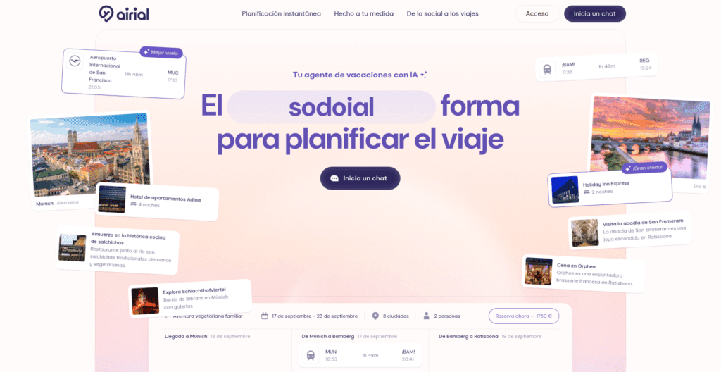 Airial genera itinerarios personalizados en tiempo real desde videos o chats, permitiendo diseñar el viaje ideal con rapidez y precisión.