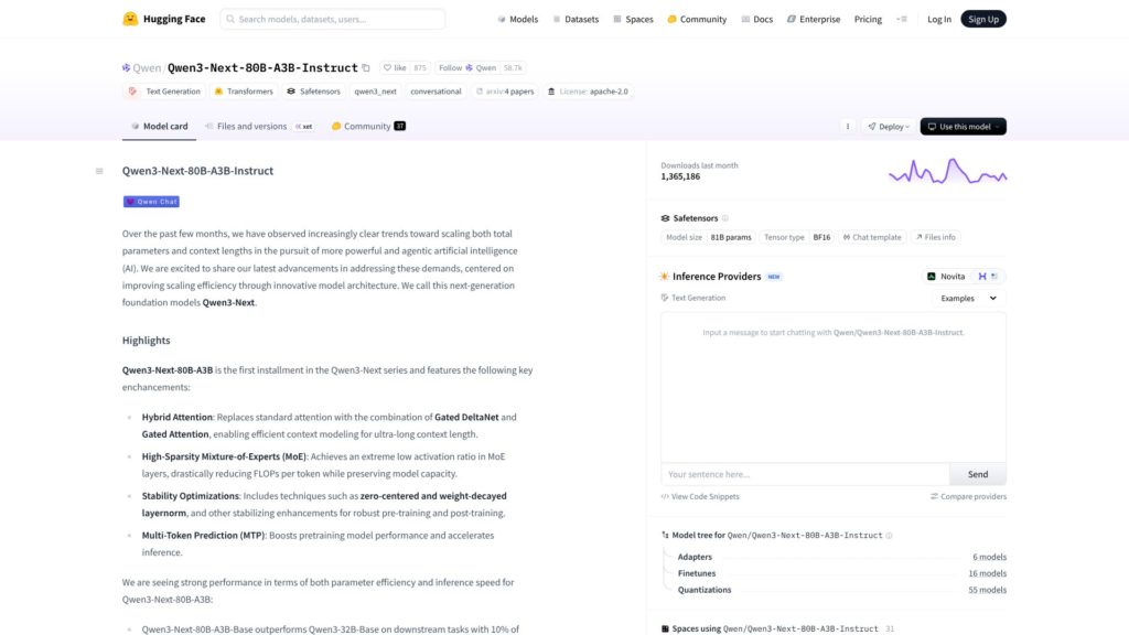 Qwen3-Next representa un hito significativo en el desarrollo de modelos de inteligencia artificial de gran escala, combinando una abundancia de parámetros (80B) con una arquitectura híbrida que maximiza la eficiencia computacional y la capacidad de manejo contextual. Su diseño avanzado permite procesar grandes volúmenes de datos multilingües con una versatilidad que favorece aplicaciones complejas de razonamiento y generación de lenguaje natural. Desde una perspectiva técnica, Qwen3-Next es especialmente recomendable para proyectos que necesiten un balance entre escala y eficiencia, incluyendo desarrollos en procesamiento del lenguaje natural, sistemas conversacionales avanzados, y aplicaciones multimodales. El uso de la licencia Apache 2.0 facilita su adopción en entornos de investigación y desarrollo colaborativo. Sin embargo, para maximizar su potencial, es crucial considerar las necesidades específicas del proyecto en cuanto a la longitud del contexto y la naturaleza híbrida de la arquitectura, que puede ajustarse para optimizar recursos según el uso requerido. En resumen, Qwen3-Next resulta una solución robusta y versátil para las demandas crecientes del campo de la IA avanzada, aportando una plataforma abierta y potente para impulsar innovaciones futuras.