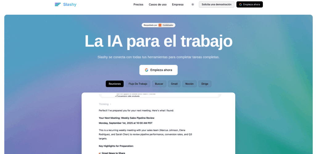 En el vertiginoso mundo de la inteligencia artificial, la eficiencia y la integración de múltiples herramientas se han convertido en elementos clave para potenciar la productividad. Slashy emerge como un recurso innovador que conecta todas tus aplicaciones y servicios para completar tareas completas de forma automatizada. Esta capacidad de interconectar diversos sistemas permite a los usuarios delegar flujos de trabajo complejos a una única plataforma inteligente, liberando tiempo y recursos valiosos. En este artículo exploraremos en profundidad qué es Slashy, cómo funciona, sus características técnicas principales y por qué representa un avance significativo en el entorno de herramientas de IA para profesionales y empresas que buscan maximizar el valor de sus ecosistemas digitales.